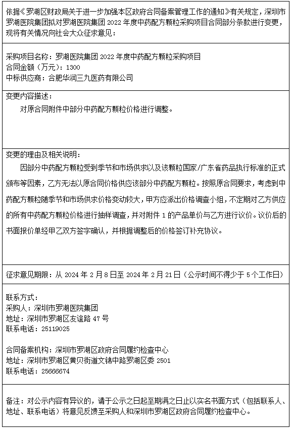 【深圳市罗湖医院集团】广东省深圳市罗湖医院集团2022年度中药配方颗粒采购项目合同变更征求意见公示
