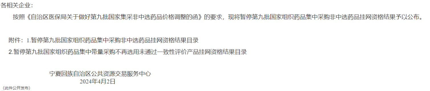 【宁夏】宁夏回族自治区关于公布暂停第九批国家组织药品集中采购非中选药品挂网资格结果的通知