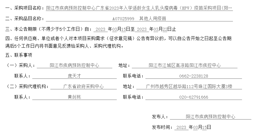 【阳江市疾病预防控制中心】广东省阳江市疾病预防控制中心广东省2023年入学适龄女生人乳头瘤病毒(HPV)疫苗采购项目(阳江市)采购需求征求意见公告