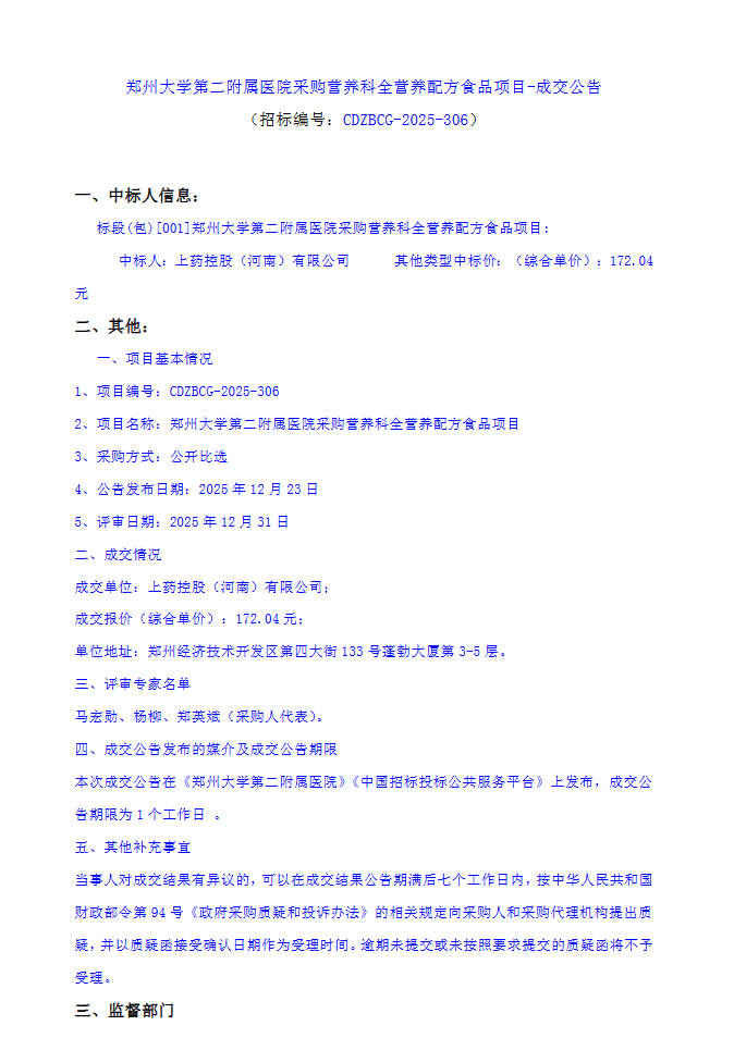 【郑州大学第二附属医院】河南省郑州大学第二附属医院采购营养科全营养配方食品项目-成交公告