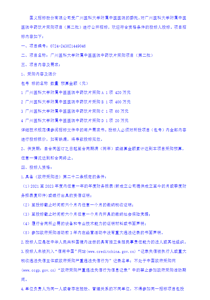 【广州医科大学附属中医医院】广东省广州医科大学附属中医医院中药饮片采购项目(第二批)招标公告