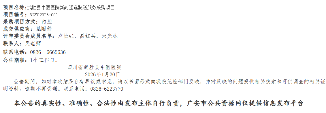 【广安市武胜县中医医院】四川省广安市武胜县中医医院新药遴选配送服务采购项目成交公告