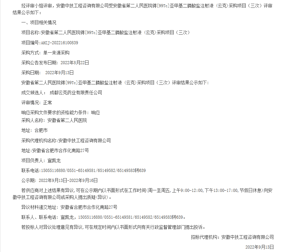 【安徽省第二人民医院】锝〔99Tc〕亚甲基二膦酸盐注射液(云克)采购项目(三次)评审结果公示