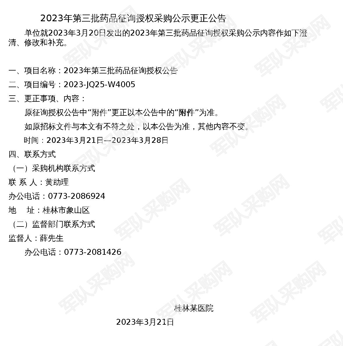 【军队采购】军队采购网2023年第三批药品征询授权采购公示更正公告(2023-JQ25-W4005)