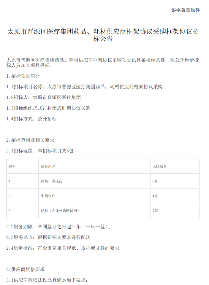 【太原市晋源区医疗集团】山西省太原市晋源区医疗集团药品、耗材供应商框架协议采购框架协议招标公告