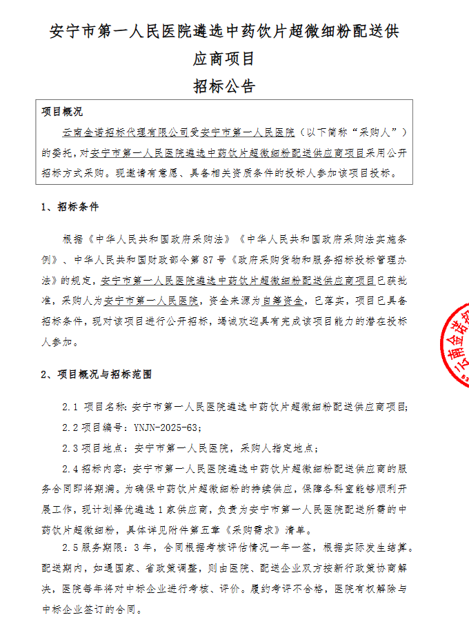 【昆明市安宁市第一人民医院】云南省安宁市第一人民医院遴选中药饮片超微细粉配送供应商项目招标公告