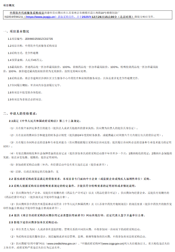 【南京市建邺区沙洲社区卫生服务中心】江苏省南京市建邺区沙洲社区卫生服务中心中药饮片代煎服务采购项目竞争性磋商公告