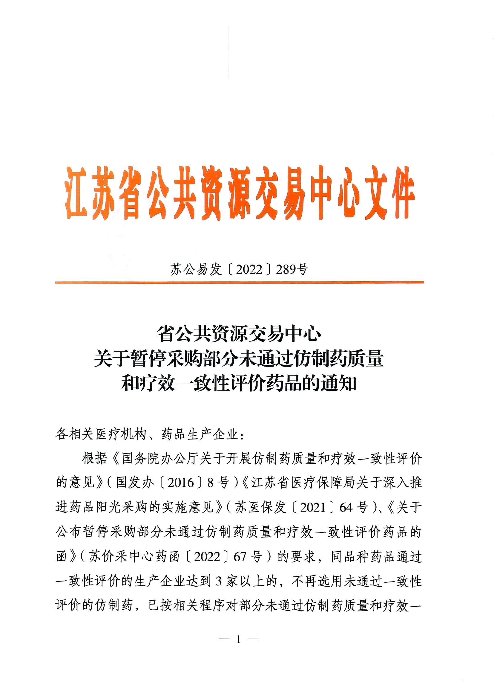 【江苏】省公共资源交易中心关于暂停采购部分未通过仿制药质量和疗效一致性评价药品的通知