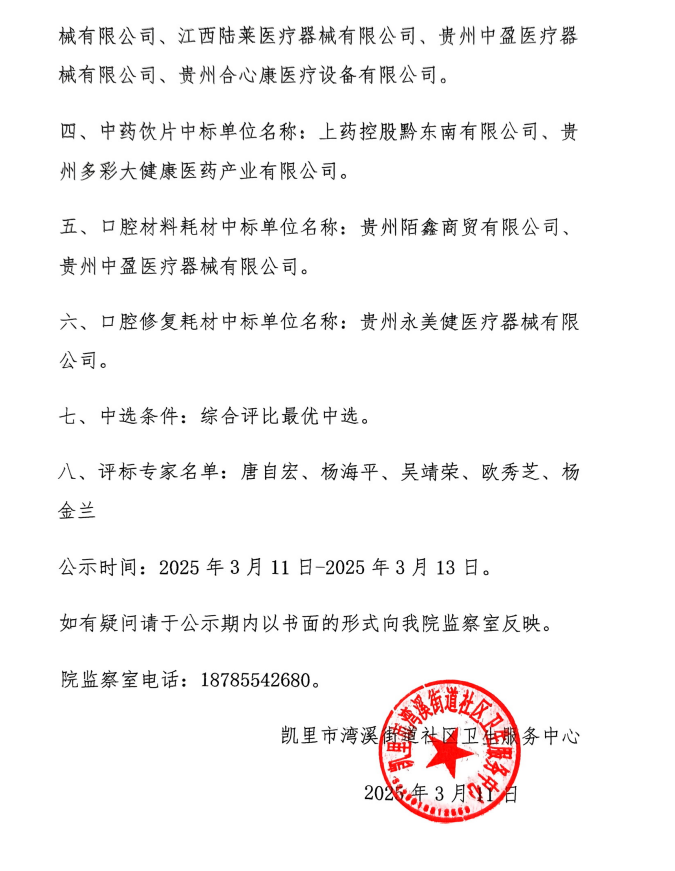 【黔东南苗族侗族自治州凯里市湾溪街道社区卫生服务中心】贵州省黔东南苗族侗族自治州凯里市湾溪街道社区卫生服务中心医用耗材、化验试剂和中药饮片供应商招采中标结果公示