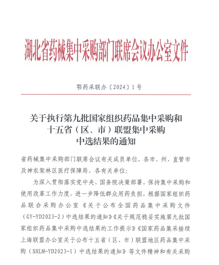 【湖北】关于执行第九批国家组织药品集中采购和十五省(区、市)联盟集中采购中选结果的通知