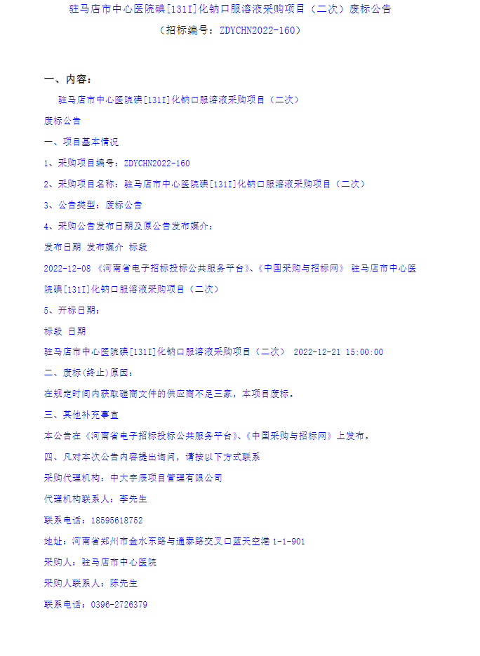 【驻马店市中心医院】河南省驻马店市中心医院碘〔131I〕化钠口服溶液采购项目(二次)废标公告