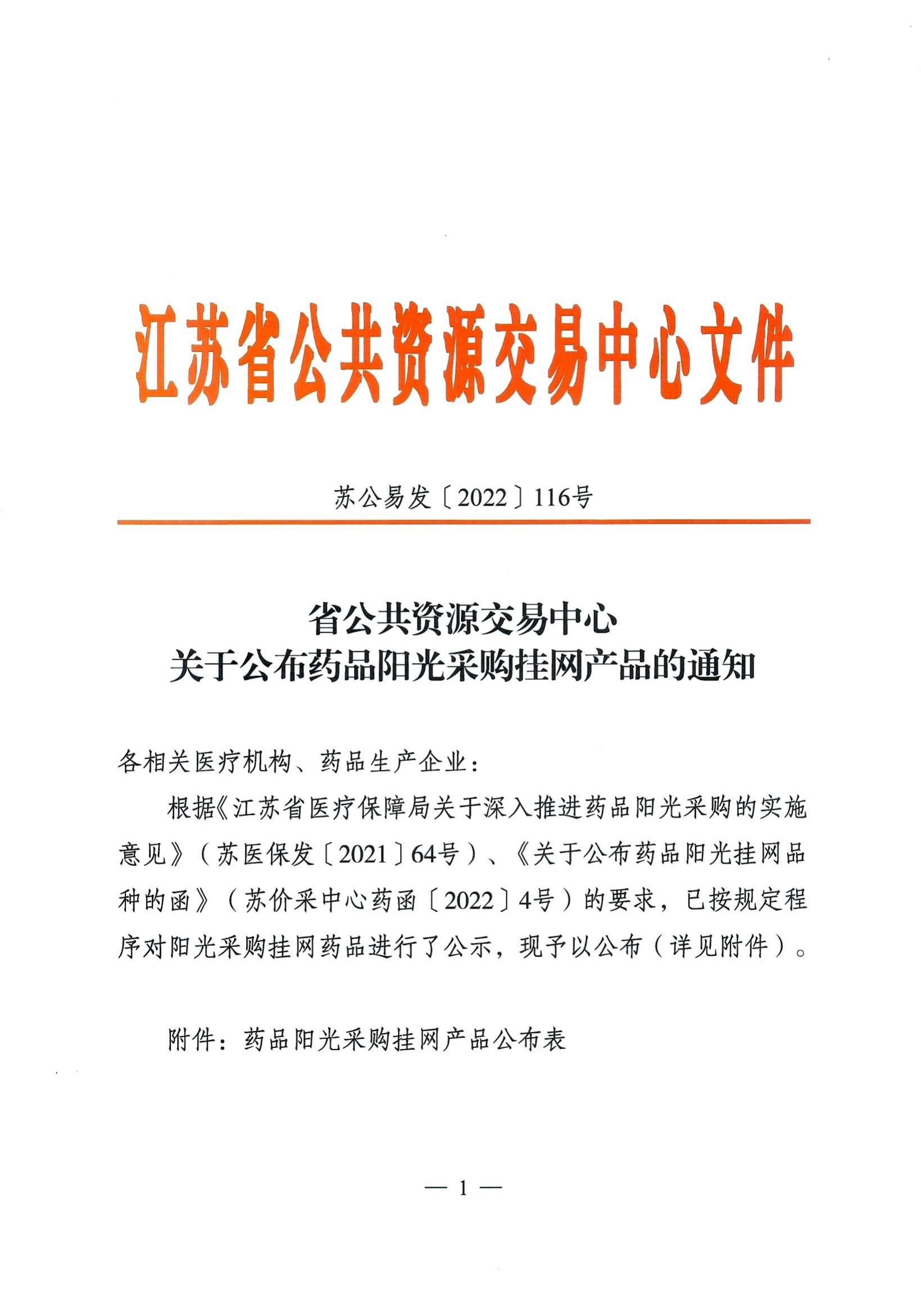 【江苏】江苏省公共资源交易中心关于公布药品阳光采购挂网产品的通知116号