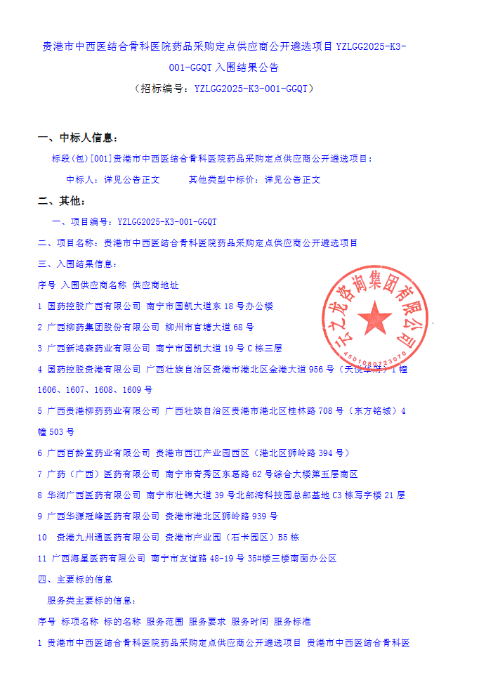 【贵港市中西医结合骨科医院】广西壮族自治区贵港市中西医结合骨科医院药品采购定点供应商公开遴选项目YZLGG2025-K3-001-GGQT入围结果公告