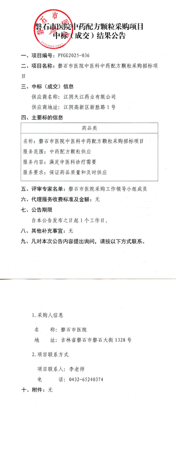 【吉林市磐石市医院】吉林省磐石市医院中药配方颗粒采购项目中标(成交)结果公告