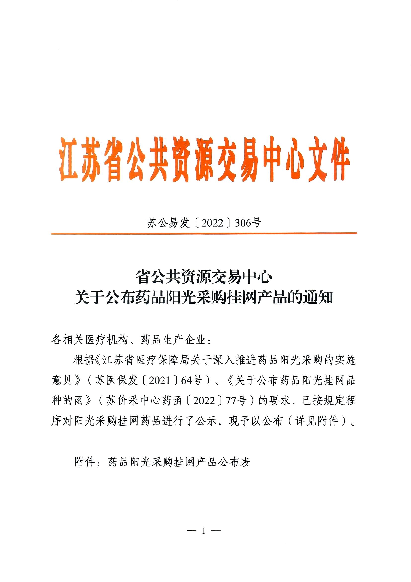 根据《江苏省医疗保障局关于深入推进药品阳光采购的实施意见》(苏医保发〔2021〕64号)、《关于公布药品阳光挂网品种的函》(苏价采中心药函〔2022〕77号)的要求,已按规定程序对阳光采购挂网药品进行了公示,现予以公布(详见附件)。