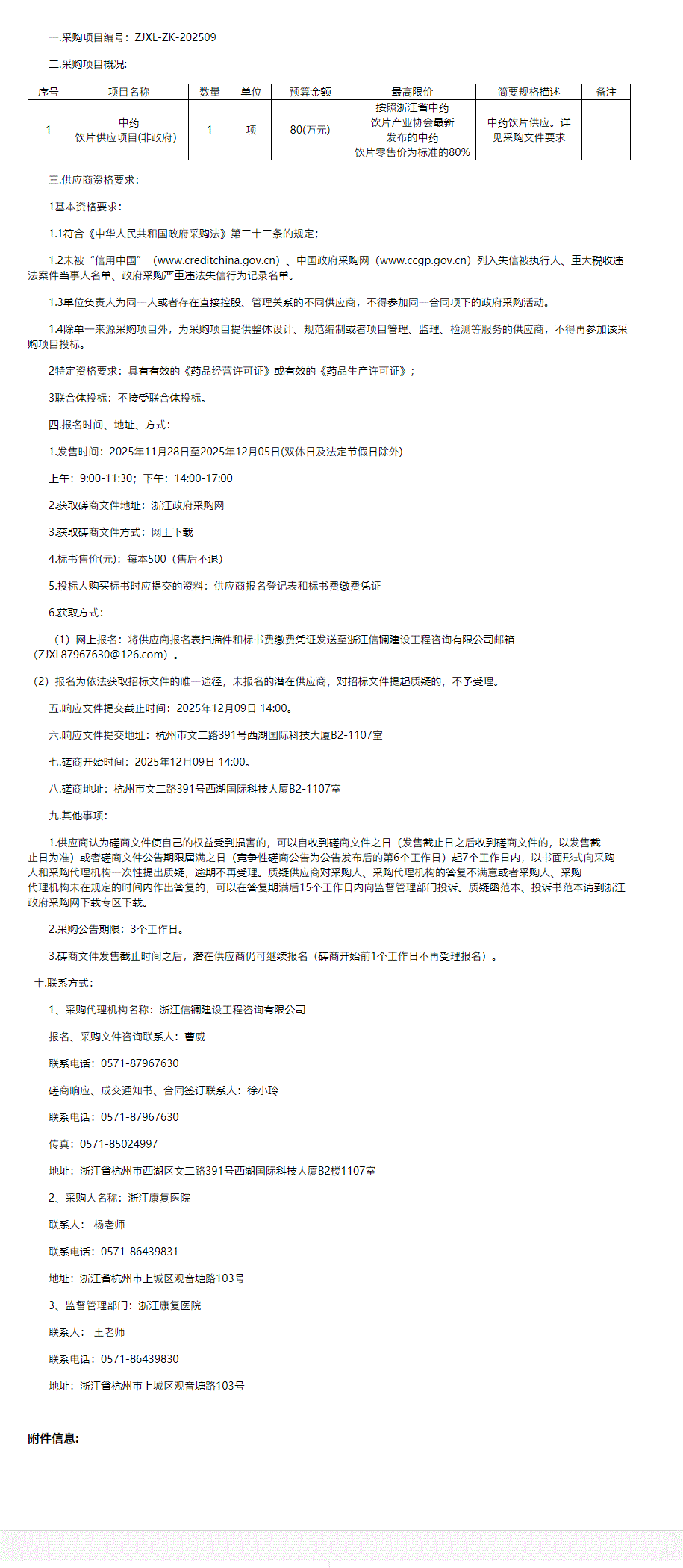 【浙江康复医院】浙江信镧建设工程咨询有限公司关于浙江康复医院中药饮片供应项目(非政府)的竞争性磋商采购公告