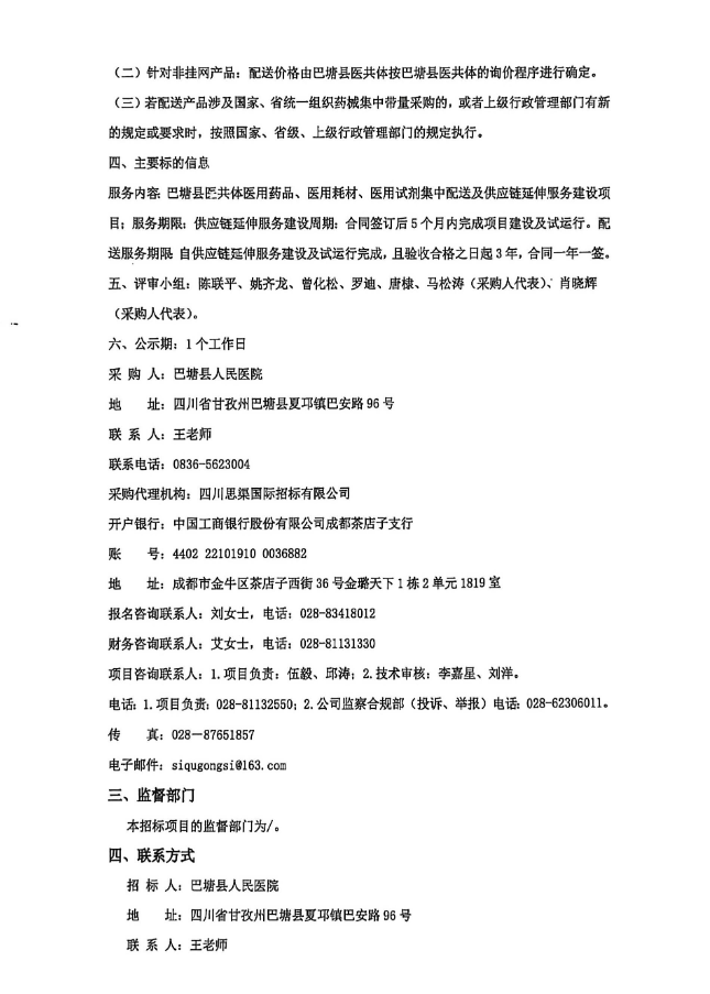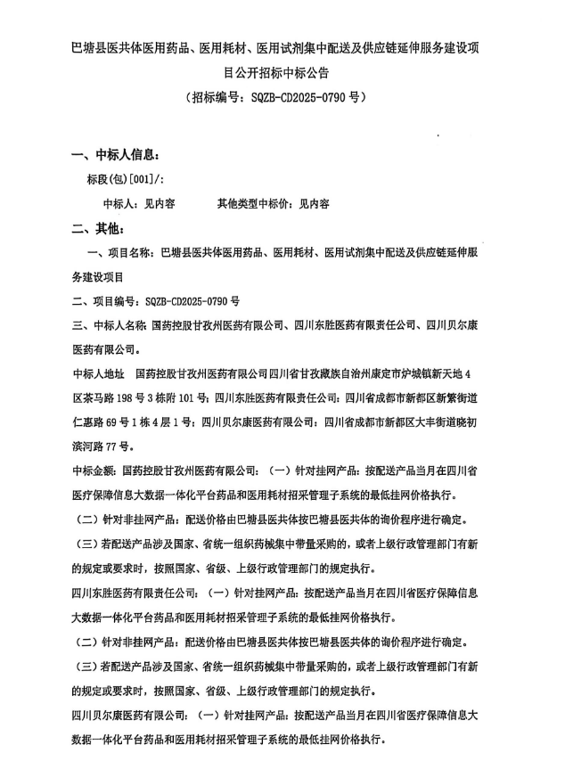 【甘孜藏族自治州巴塘县人民医院】四川省甘孜藏族自治州巴塘县医共体医用药品、医用耗材、医用试剂集中配送及供应链延伸服务建设项目公开招标中标公告