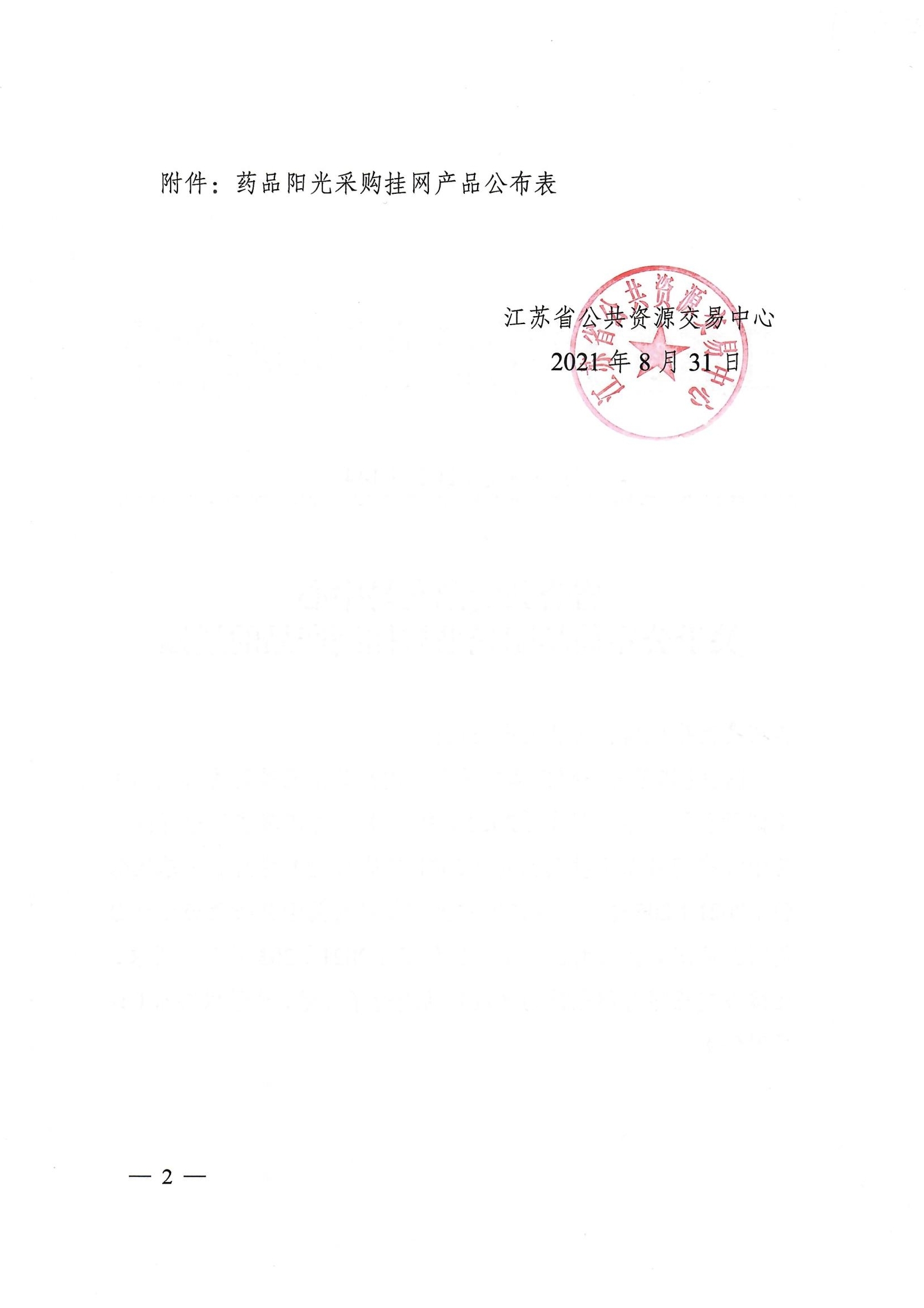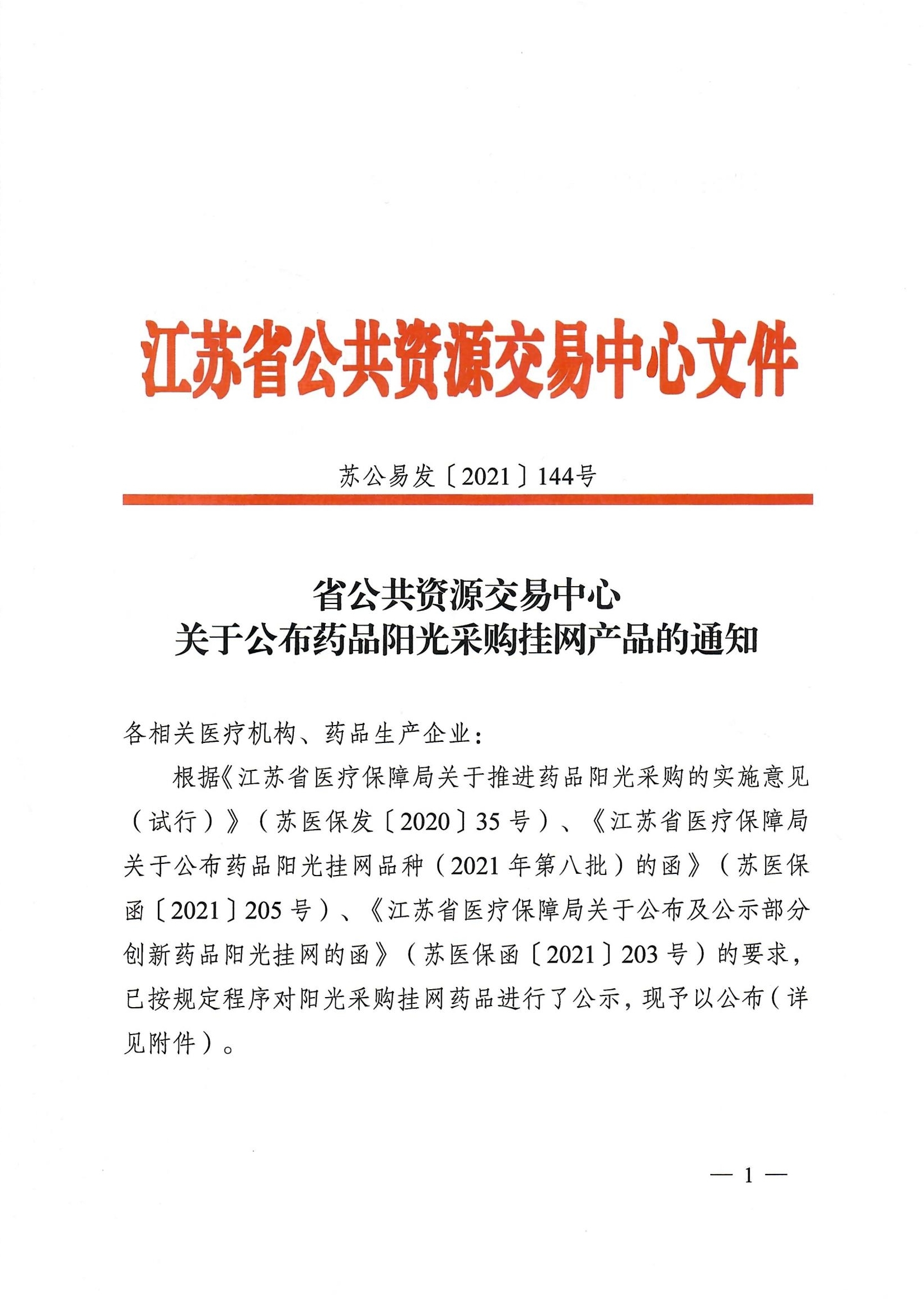 【江苏】2021年江苏省公共资源交易中心关于公布药品阳光采购挂网产品的通知 苏公易发[2021]144号