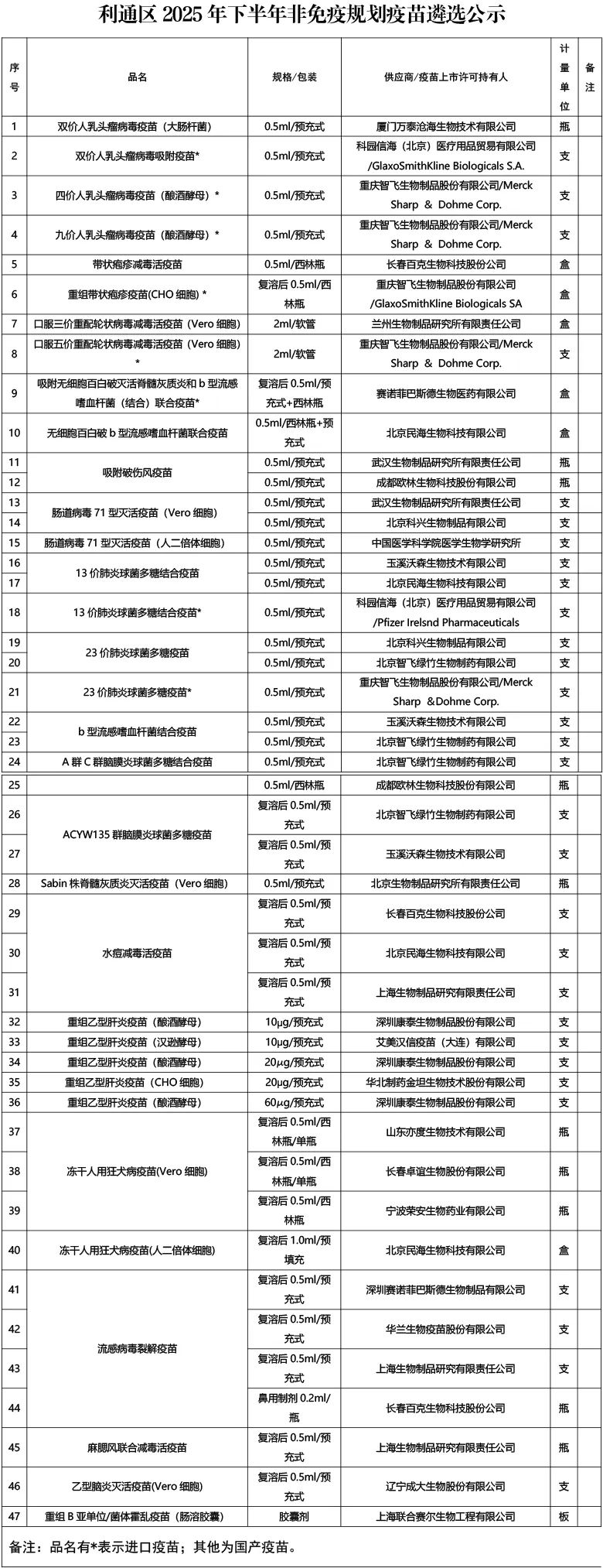 为进一步规范利通区非免疫规划疫苗的采购和供应工作,确保非免疫规划疫苗使用科学规范、预防接种安全有效,2025年6月12日在利通区疾控中心召开了2025年下半年非免疫规划疫苗的集中遴选会议,现将此次利通区非免疫规划疫苗遴选结果予以公示(见附件),遴选周期内突发事件需要应急接种的非免疫规划疫苗可即时采购。公示时间:2025年6月13日至6月20日(七个自然日)。如有异议或其他问题,请在公示期内及时反映,联系电话:0953-2643207