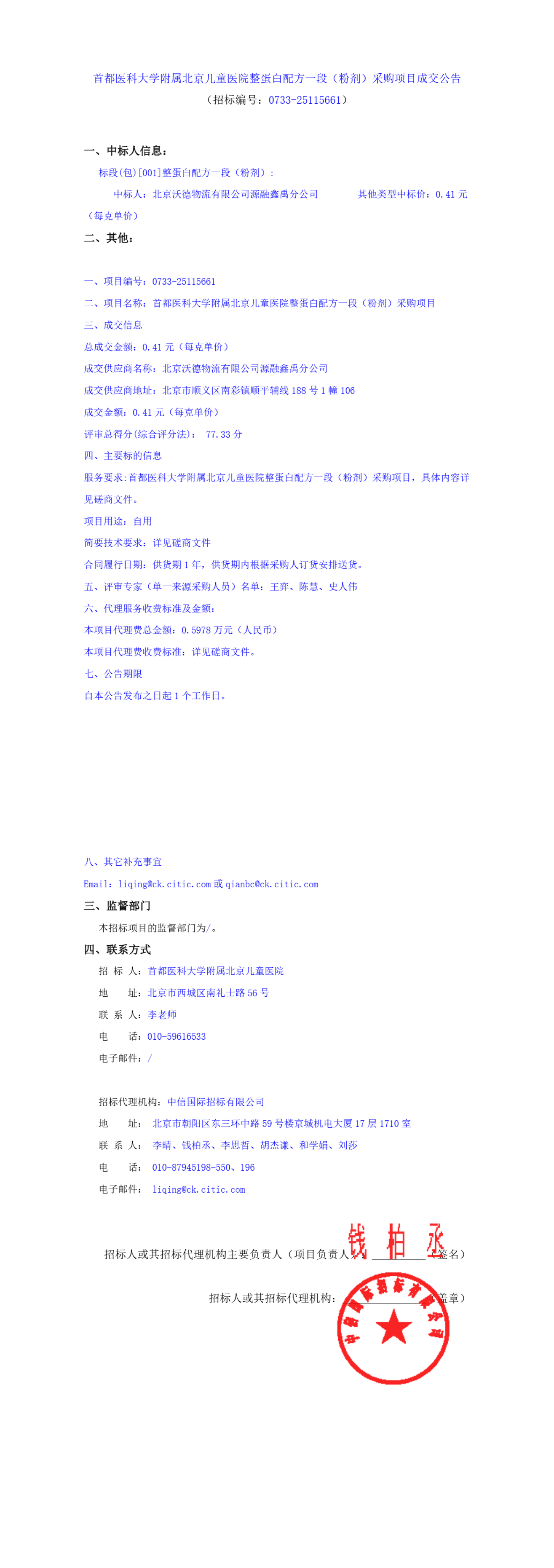 【首都医科大学附属北京儿童医院】北京市首都医科大学附属北京儿童医院整蛋白配方一段(粉剂)采购项目成交公告