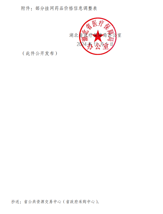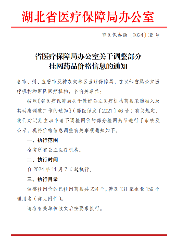 【鄂州】鄂医保办函【2024】36号省医疗保障局办公室关于调整部分挂网药品价格信息的通知