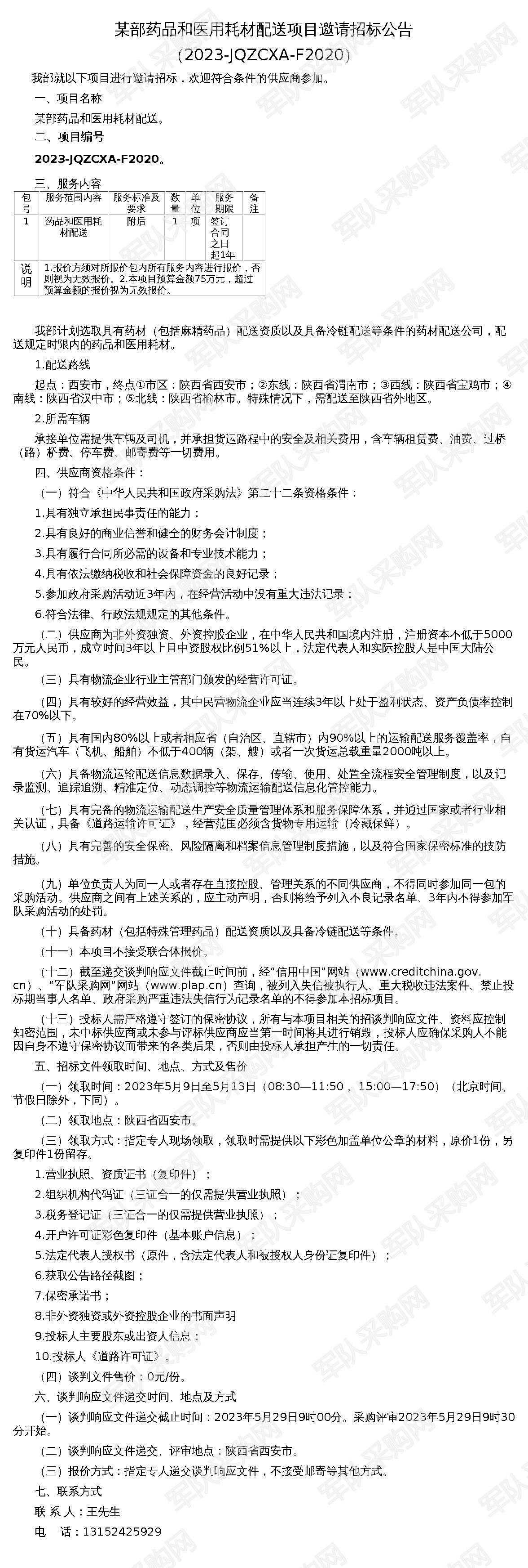 【军队采购】军队采购网某部药品和医用耗材配送项目邀请招标公告(2023-JQZCXA-F2020)