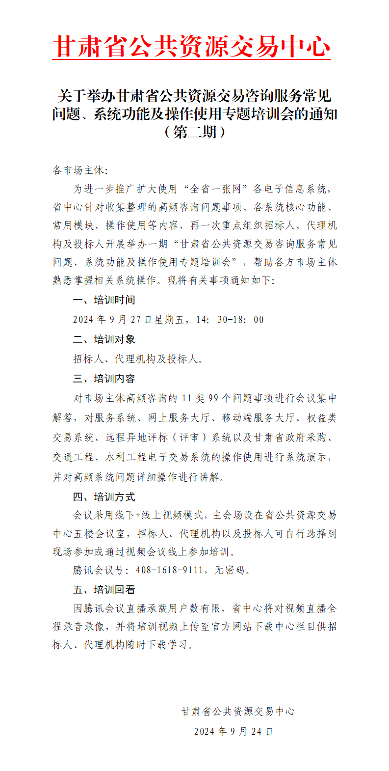 为进一步推广扩大使用“全省一张网”各电子信息系统,省中心针对收集整理的高频咨询问题事项、各系统核心功能、常用模块、操作使用等内容,再一次重点组织招标人、代理机构及投标人开展举办一期“甘肃省公共资源交易咨询服务常见问题、系统功能及操作使用专题培训会”,帮助各方市场主体熟悉掌握相关系统操作。现将有关事项通知如下: