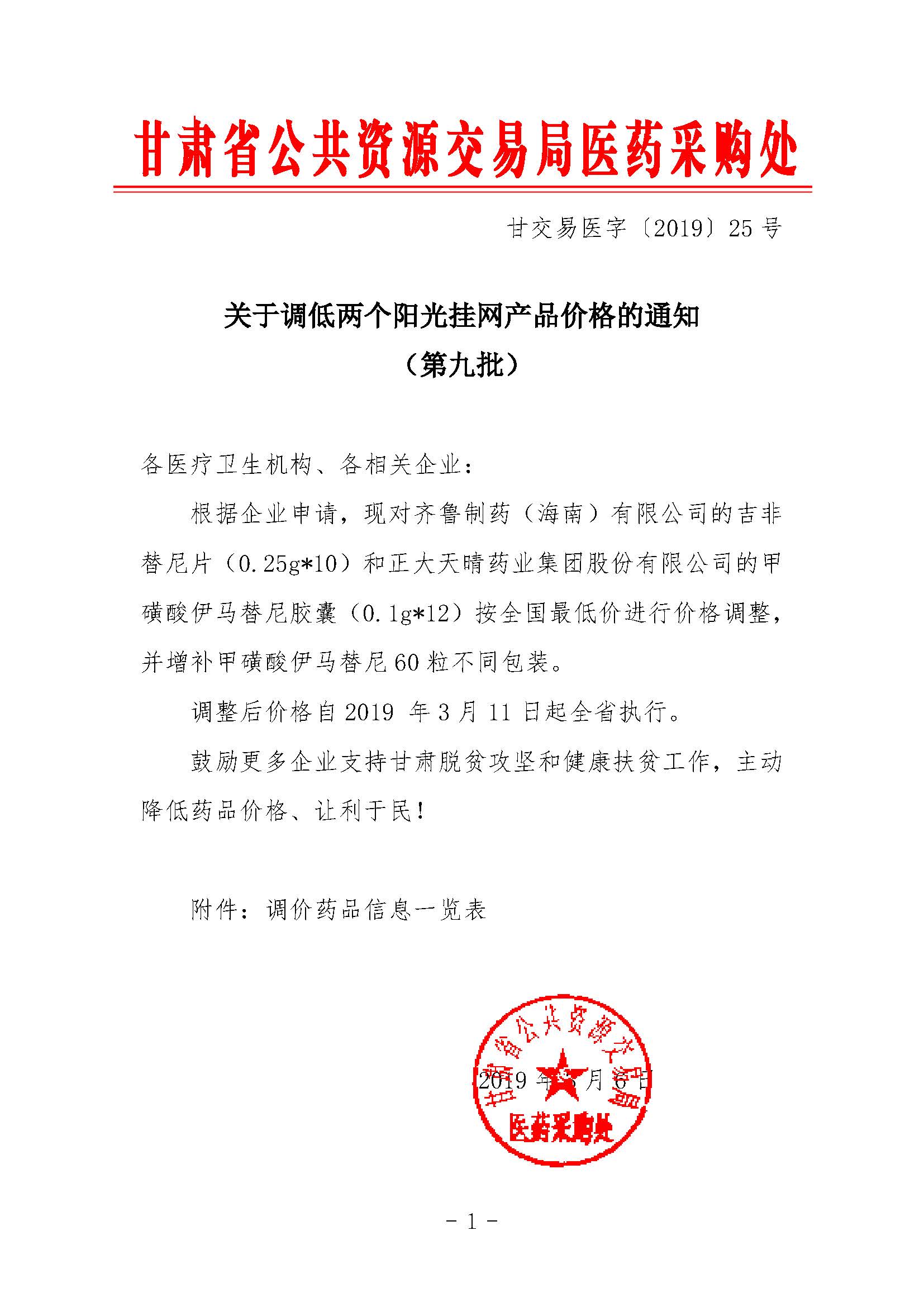 【甘肃】甘肃省关于调低两个阳光挂网产品价格的通知(第九批) 甘交易医字〔2019〕25号