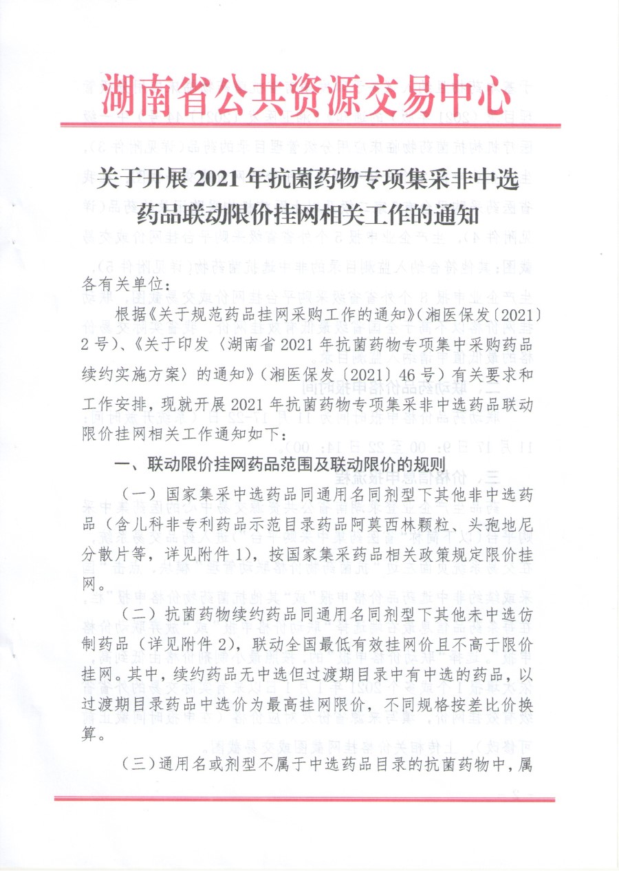 【湖南】湖南省关于开展2021年抗菌药物专项集采非中心管药品联动限价挂网相关工作的通知