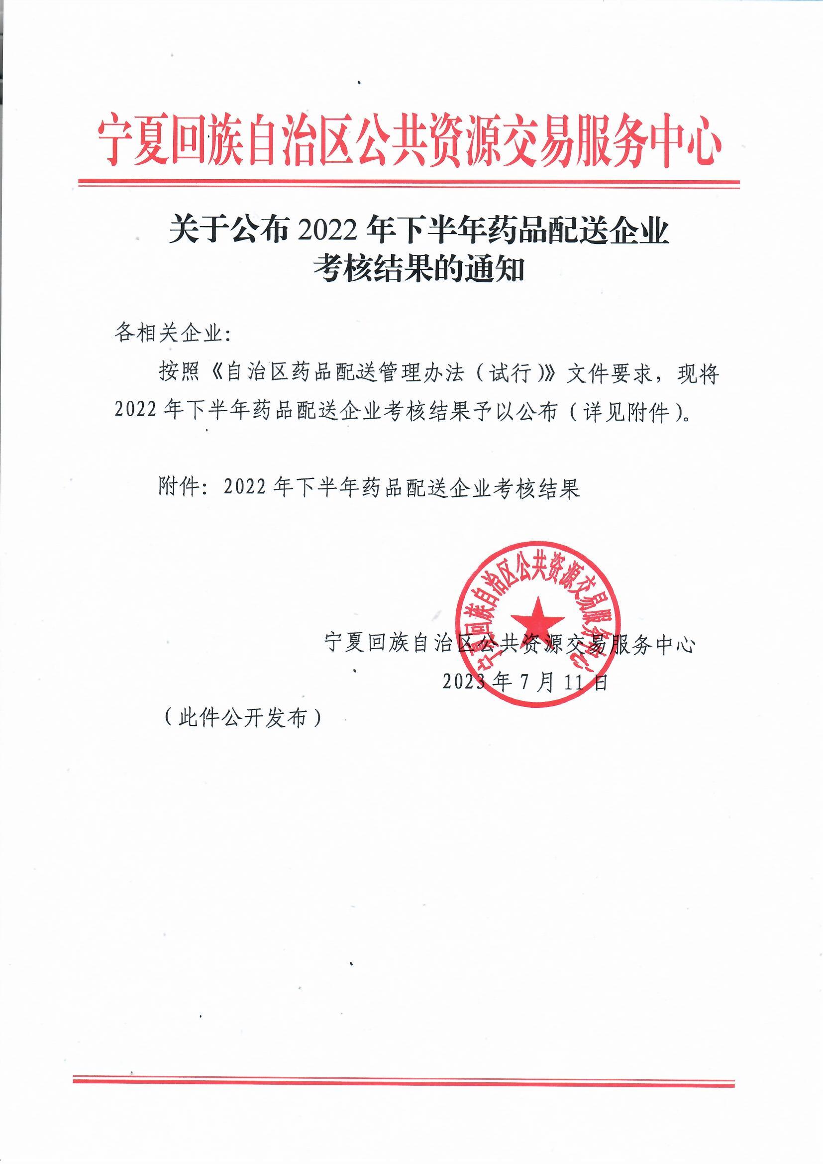 【宁夏】关于公布2022年下半年药品配送企业考核结果的通知