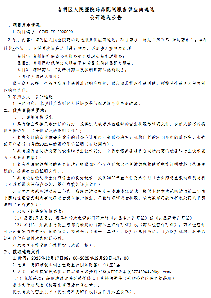 【贵阳市南明区人民医院】贵州省贵阳市南明区人民医院药品配送服务供应商遴选公开遴选公告