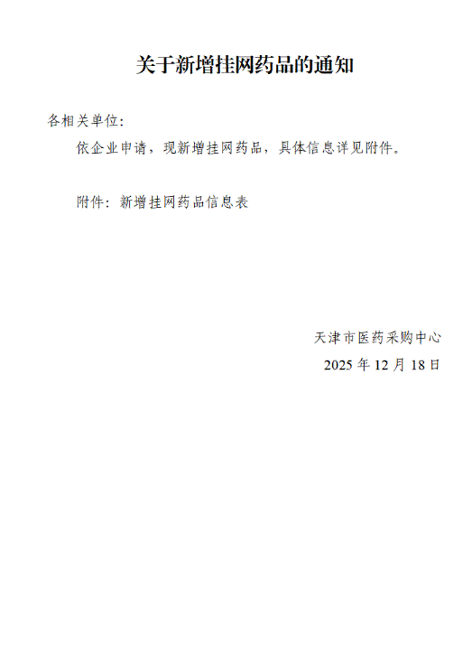 【天津】天津市关于新增挂网药品的通知(20251218)