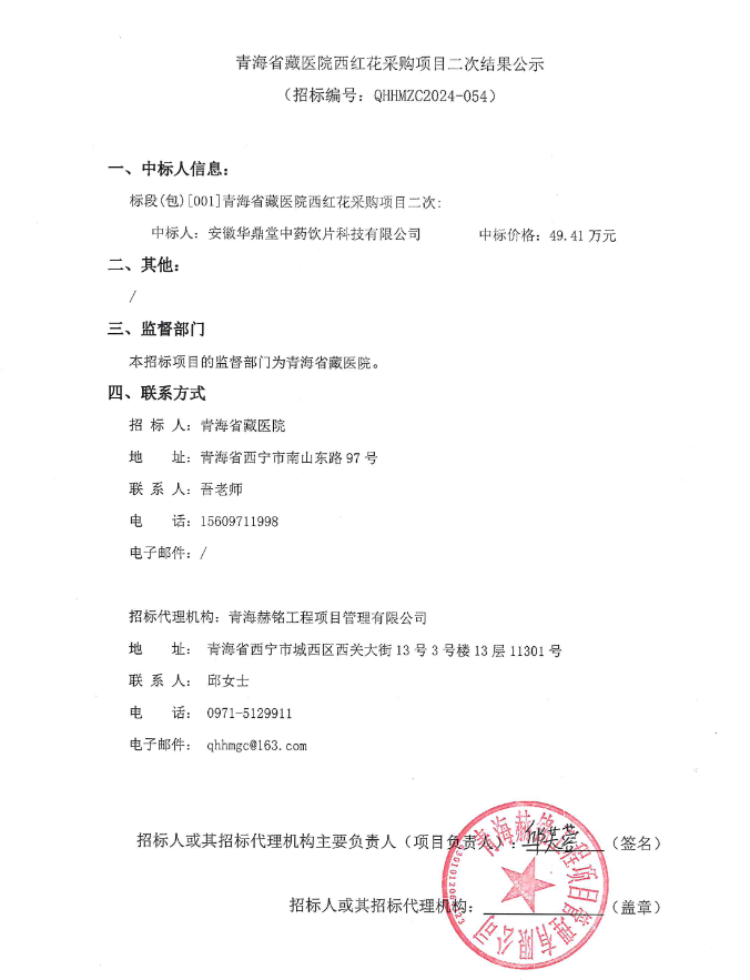 【青海省藏医院】青海省藏医院西红花采购项目二次结果公示