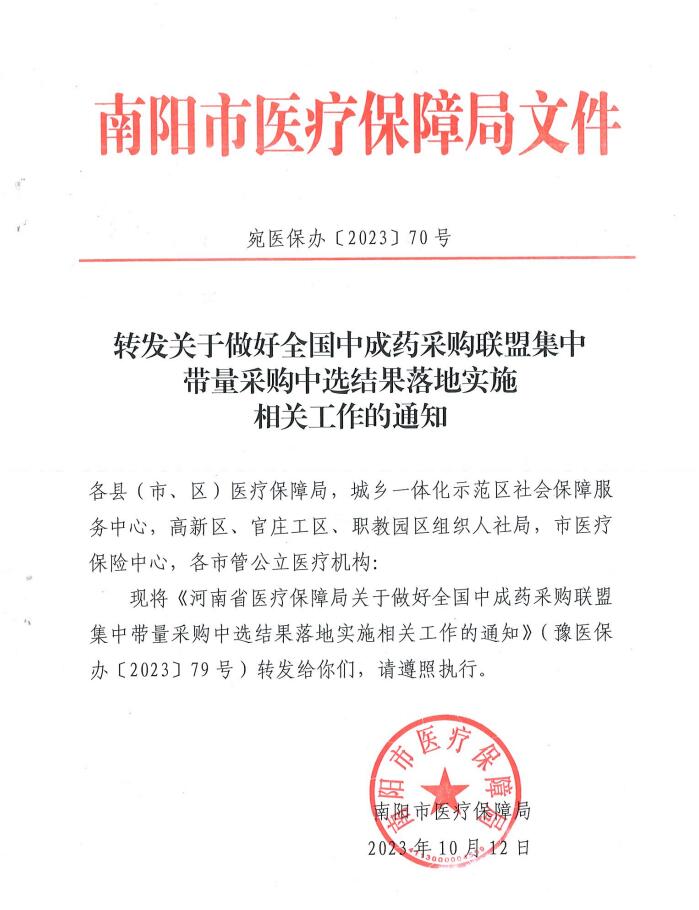 【南阳】转发关于做好全国中成药采购联盟集中带量采购中选结果落地实施相关工作的通知
