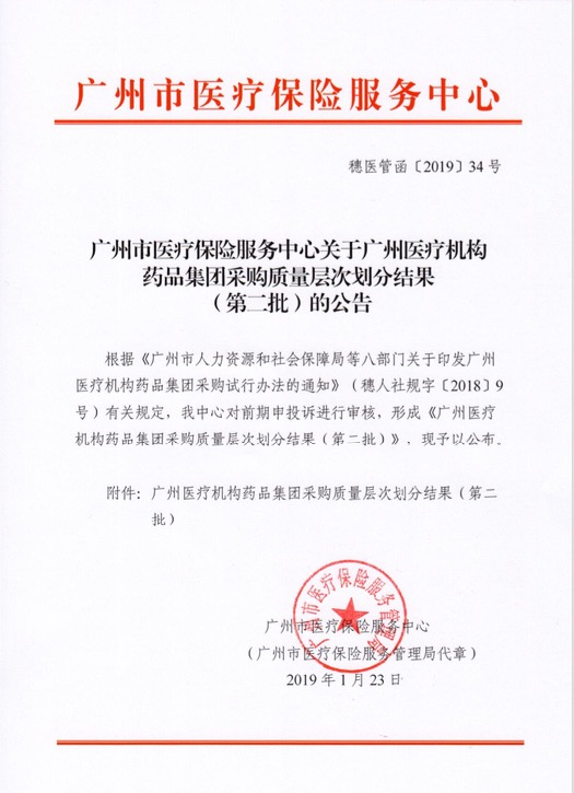 【广州】广东省广州市医疗保险服务中心关于广州医疗机构药品集团采购质量层次划分结果(第二批)的公告