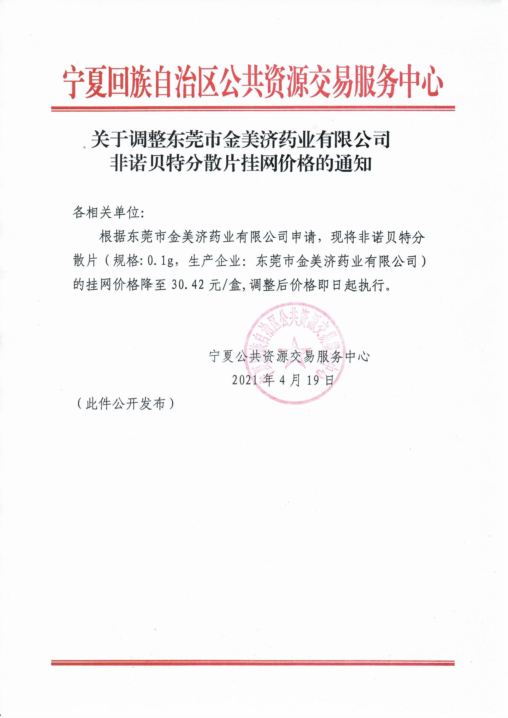 【宁夏】2021年宁夏自治区关于调整东莞市金美济药业有限公司非诺贝特分散片挂网价格的通知