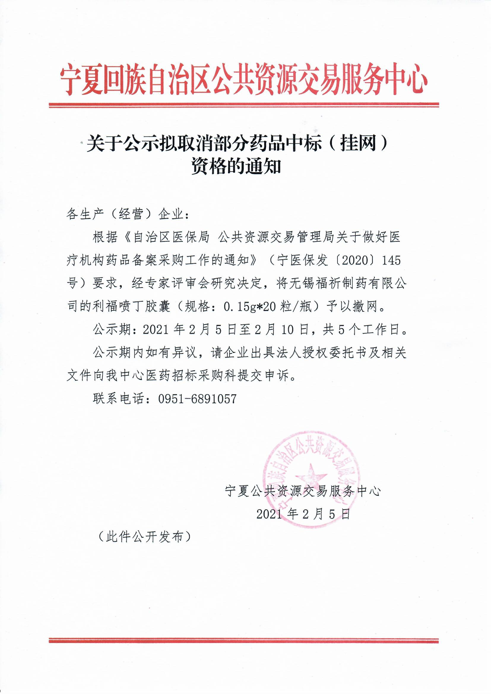 【宁夏回族自治区】宁夏回族自治区关于公示拟取消部分药品中标(挂网)资格的通知(20210205)