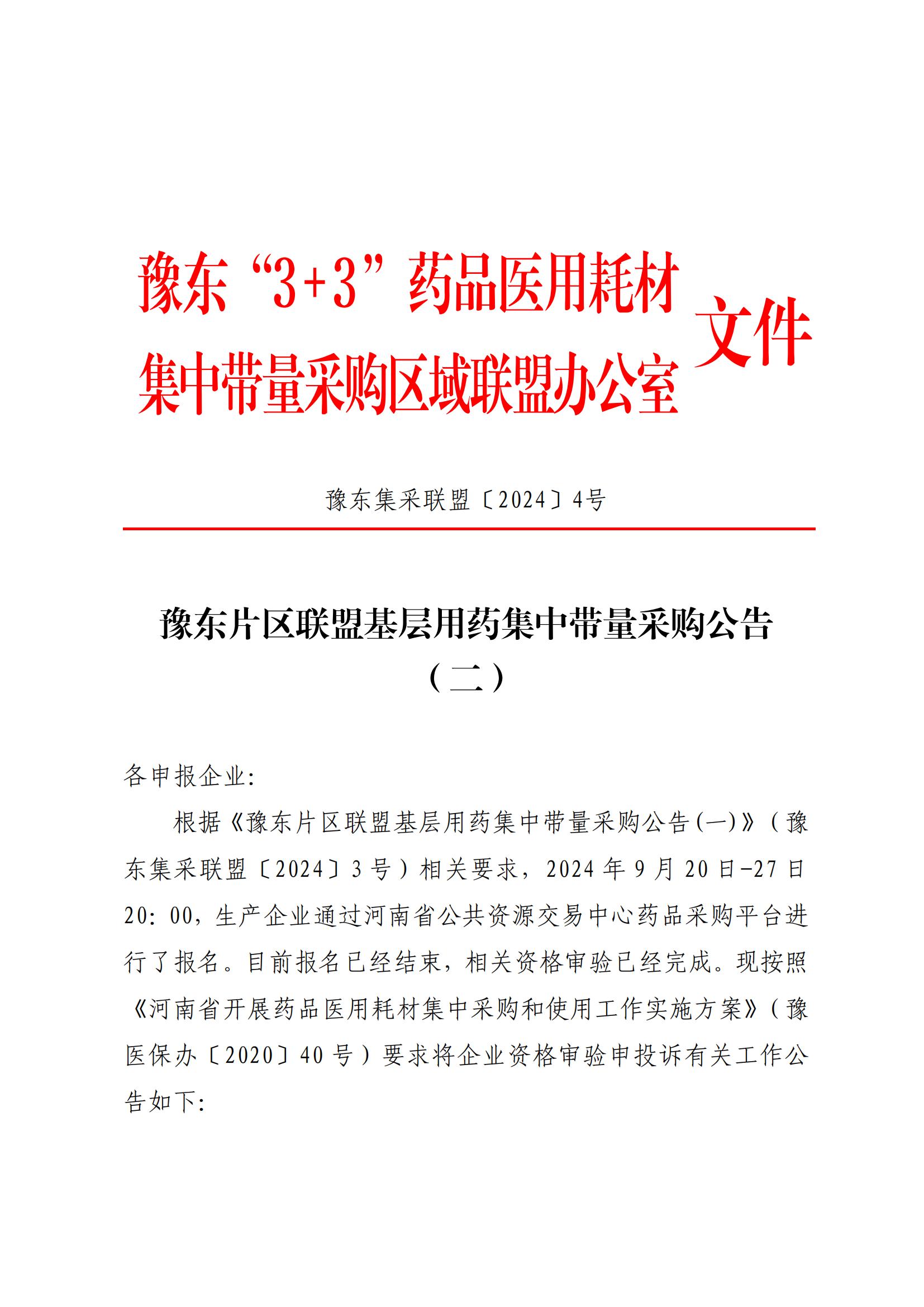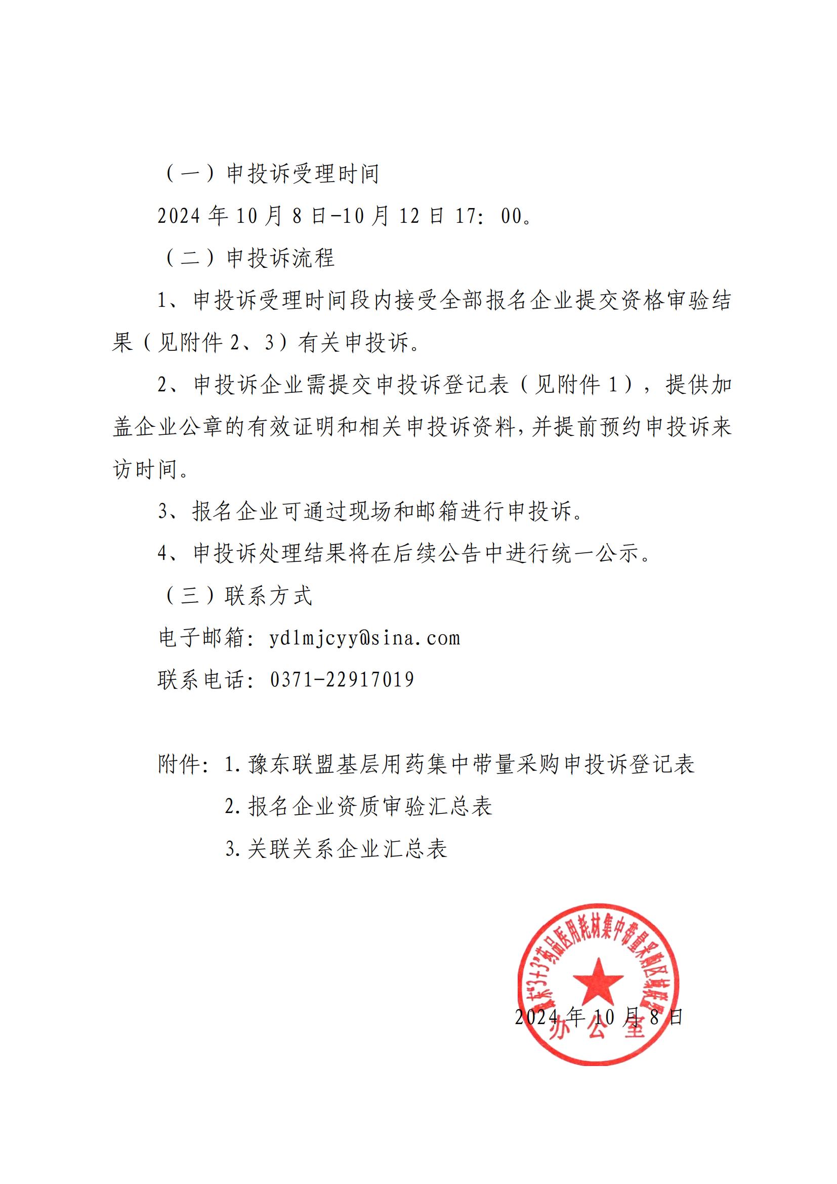 根据《豫东片区联盟基层用药集中带量采购公告(一)》(豫东集采联盟〔2024〕3号)相关要求,2024年9月20日-27日20:00,生产企业通过河南省公共资源交易中心药品采购平台进行了报名。目前报名已经结束,相关资格审验已经完成。现按照《河南省开展药品医用耗材集中采购和使用工作实施方案》(豫医保办〔2020〕40号)要求将企业资格审验申投诉有关工作公告如下: