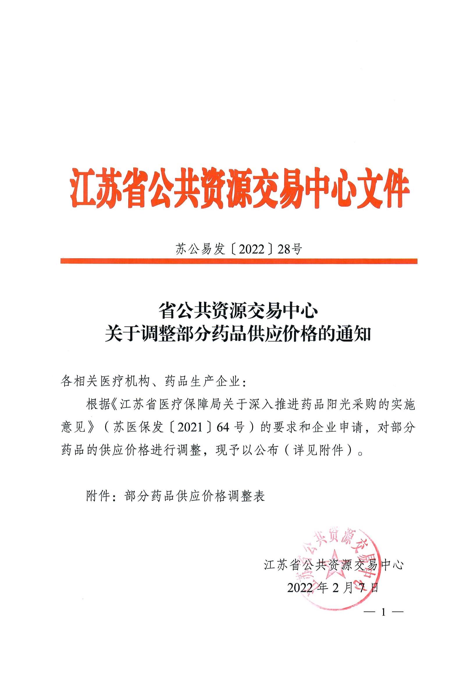 【江苏】省公共资源交易中心关于调整部分药品供应价格的通知