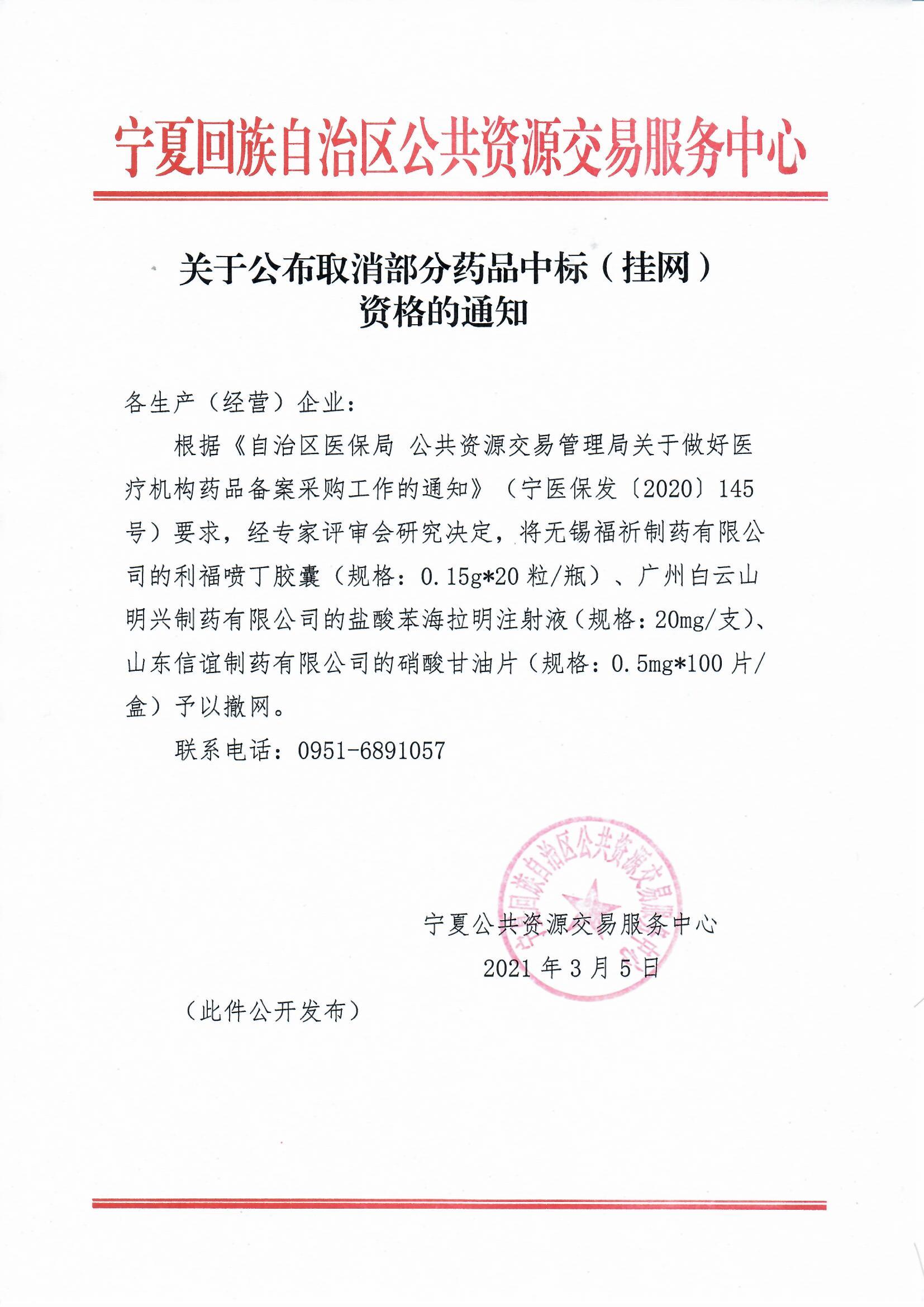 【宁夏】2021年宁夏自治区关于公布取消部分药品中标(挂网)资格的通知