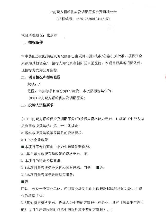 【北京市朝阳区中医医院】北京市朝阳区中医医院中药配方颗粒供应及调配服务公开招标公告