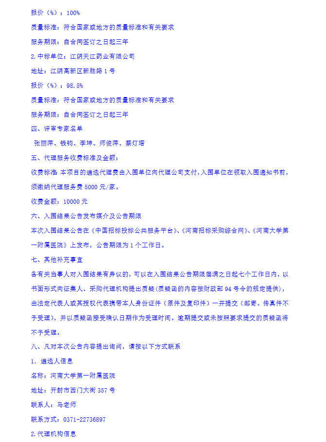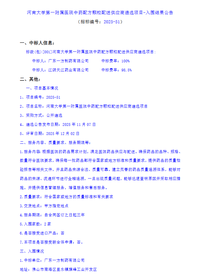 【河南大学第一附属医院】河南大学第一附属医院中药配方颗粒配送供应商遴选项目-入围结果公告