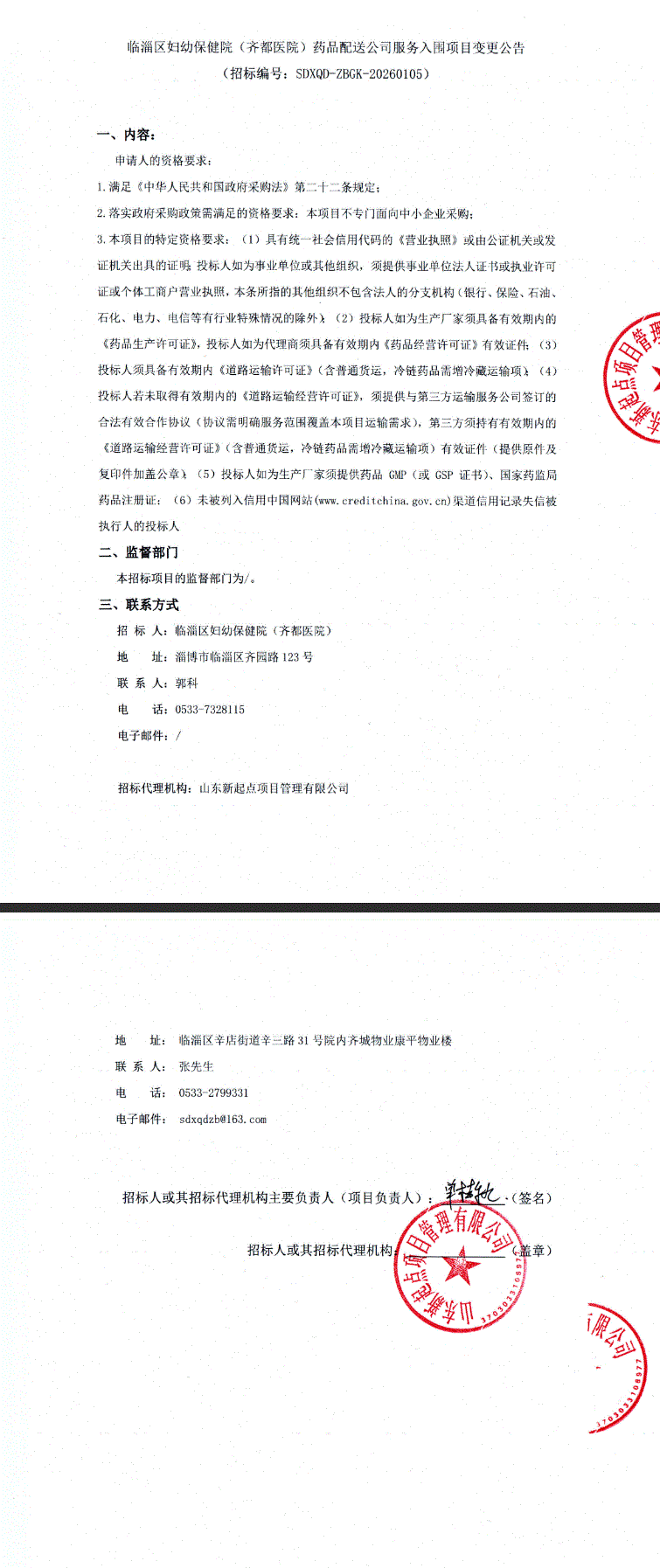 【淄博市临淄区妇幼保健院】山东省淄博市临淄区妇幼保健院(齐都医院)药品配送公司服务入围项目变更公告
