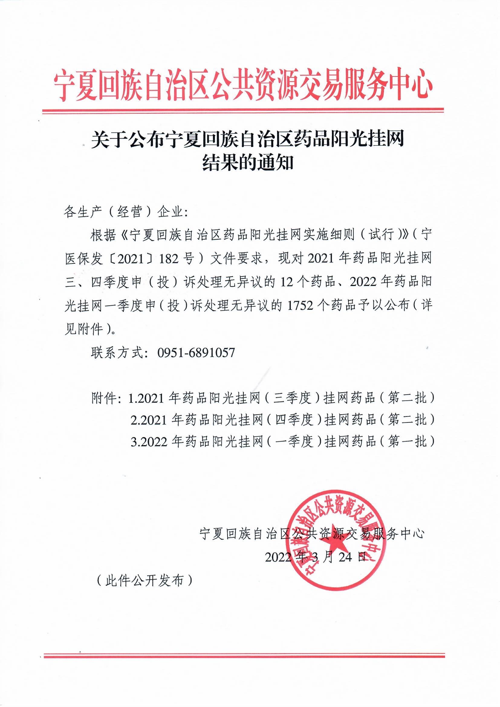 【宁夏】关于公布宁夏回族自治区药品阳光挂网结果的通知