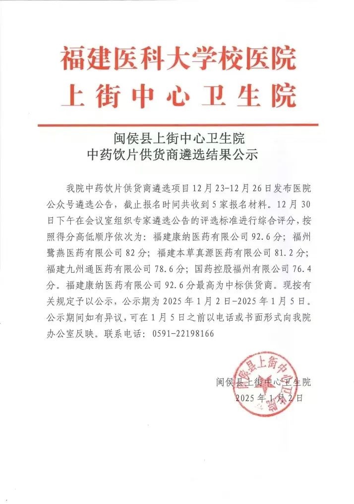 【福州市闽侯县上街中心卫生院】福建省福州市闽侯县上街中心卫生院中药饮片供货商遴选结果公示