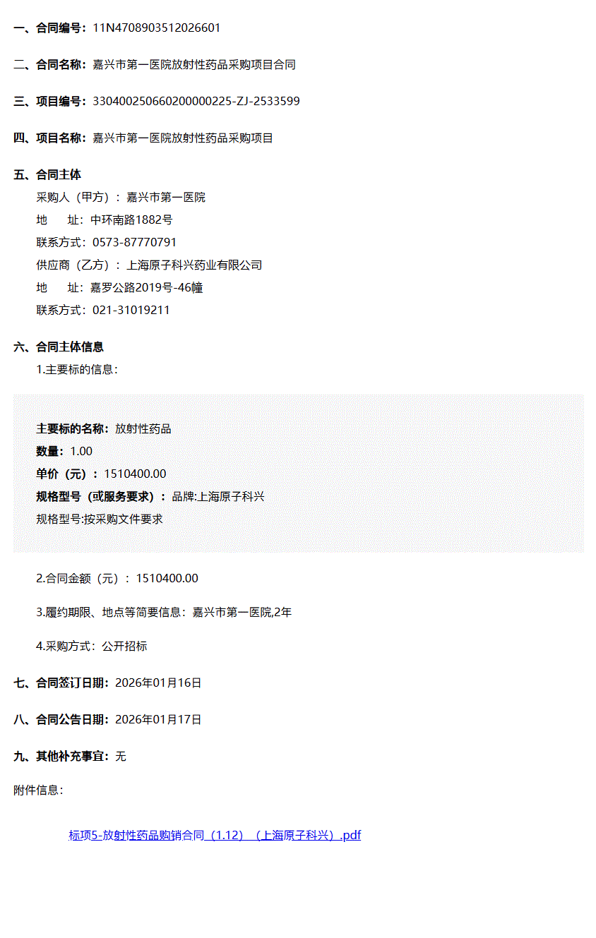 【嘉兴市第一医院】浙江省嘉兴市第一医院放射性药品采购项目合同公告2