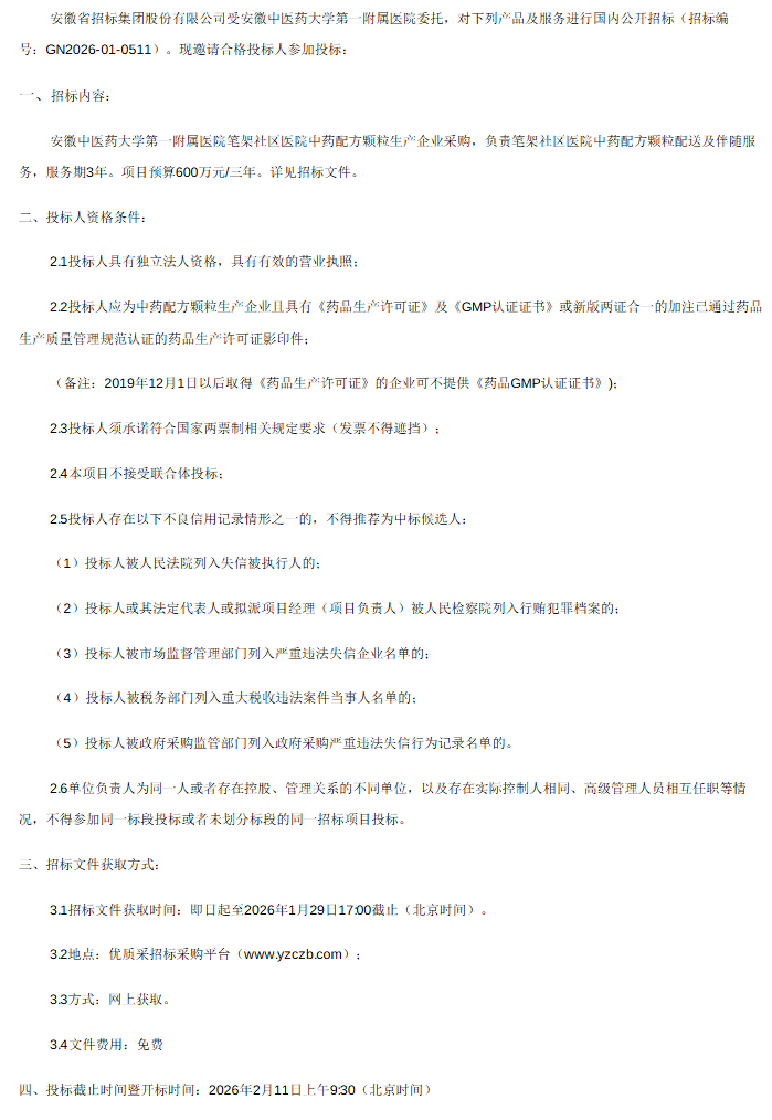 【安徽中医药大学第一附属医院】安徽中医药大学第一附属医院笔架社区医院中药配方颗粒生产企业采购招标公告