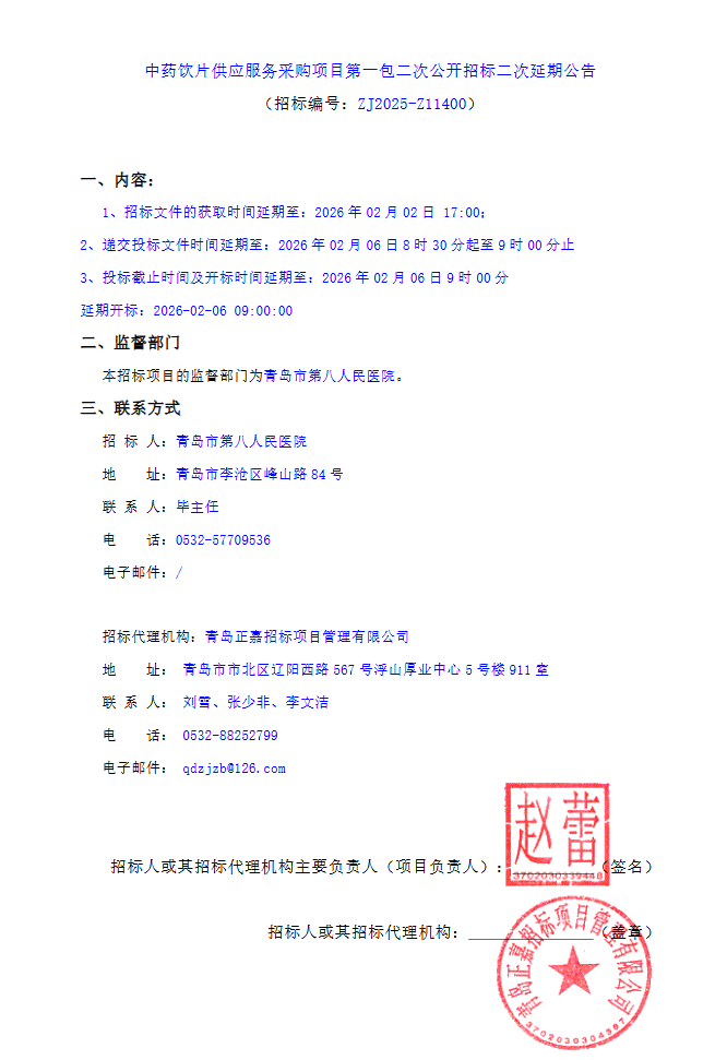 【青岛市第八人民医院】山东省青岛市第八人民医院中药饮片供应服务采购项目第一包二次公开招标二次延期公告