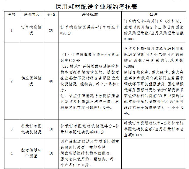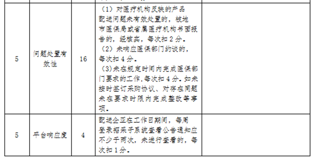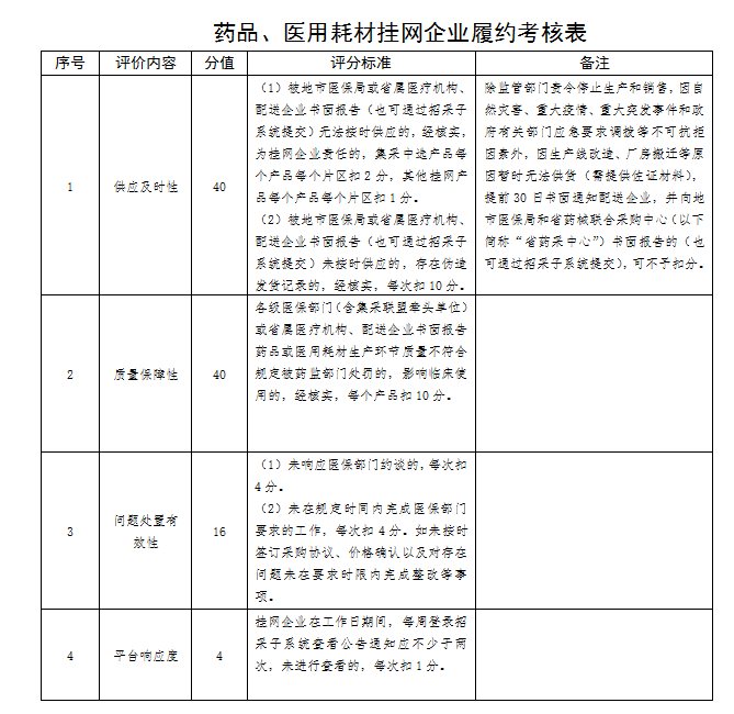 (一)药品和医用耗材挂网企业主要考核供应及时性、质量保障性、问题处置有效性、平台响应度等。具体见下表: