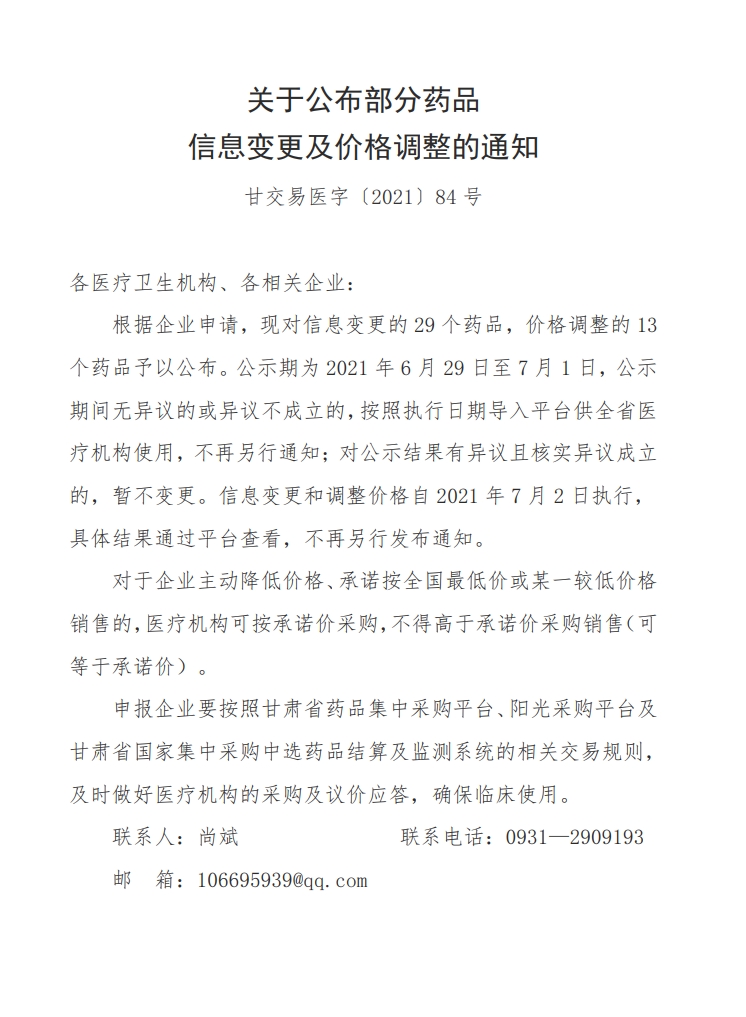 【甘肃】甘肃省关于公布部分药品信息变更及价格调整的通知(20210628)